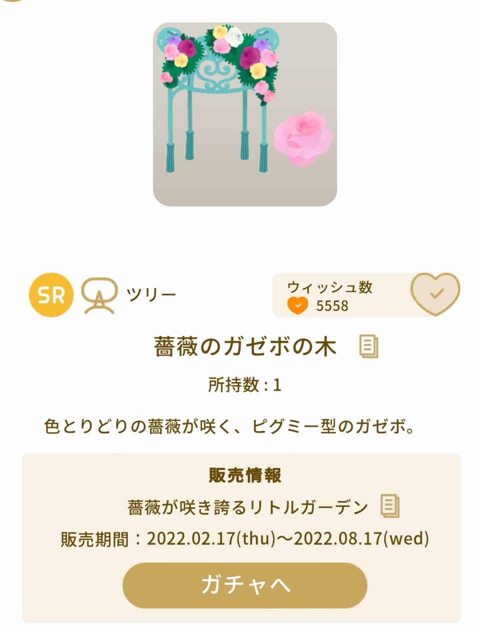 #薔薇が咲き誇るリトルガーデン を10連回したら、一発で薔薇のガゼボの木が当たったのだった。